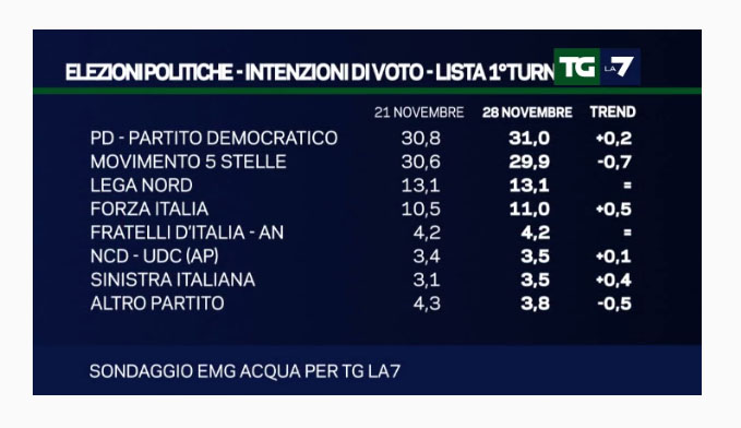 Senza dimenticare che anche se vige il silenzio elettorale sui sondaggi del referendum, si possono pubblicare comunque quelli sulle elezioni politiche, con cui analizzare le intenzioni di voto su Movimento 5 Stelle, Partito Democratico e Centrodestra.