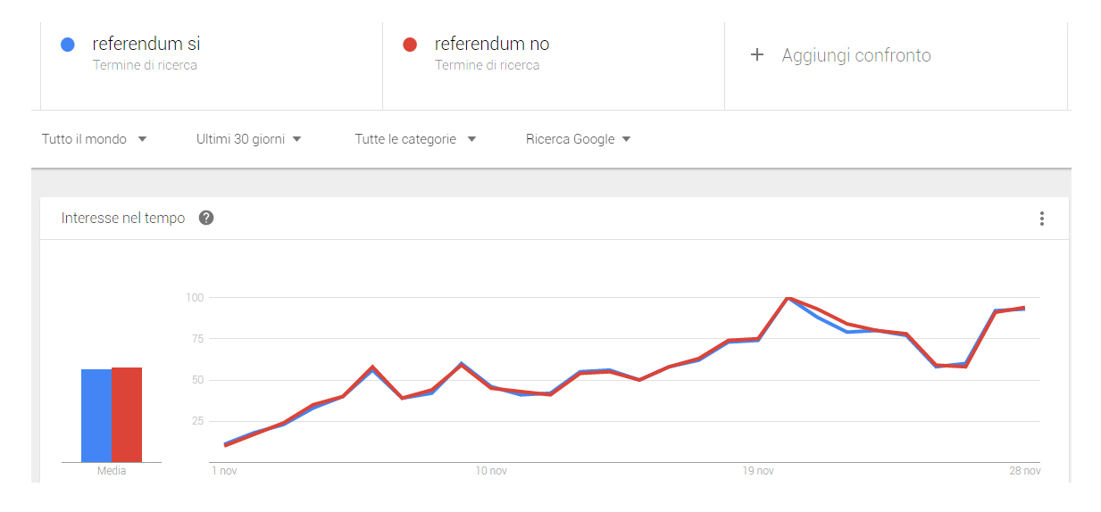 Naturalmente non è detto che sia così, tuttavia è interessante vedere come al momento i volumi di ricerca per il Sì e il No siano più o meno gli stessi, con il No in leggero vantaggio (93 a 92). L’andamento dei due fronti comunque è stato sempre lo stesso, tranne nel periodo intorno al 22 novembre quando le ricerche sul Sì al referendum sono calate sensibilmente.