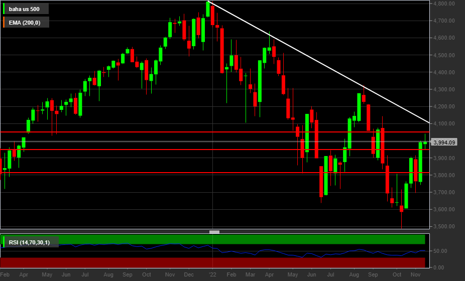 Le quotazioni dell’indice benchmark americano sono in pressing su una resistenza critica a 4.000-4.050 punti, al culmine di un rialzo supportato dai recenti dati sull’inflazione americana che indicano un rallentamento (al 7,7% a ottobre dall’8,2%) permettendo di scommettere su una Fed meno aggressiva sui tassi. Non tutti i membri della Fed sono concordi nel considerare il picco di inflazione alle spalle: per il governatore della Fed, Christopher Waller, «c’è ancora molta strada da fare» e la reazione dei mercati finanziari è stata eccessivamente ottimistica. La numero due della Fed, Lael Brainard, ritiene rassicuranti i recenti dati sull’inflazione e possibile un rallentamento del ritmo di aumento dei tassi.