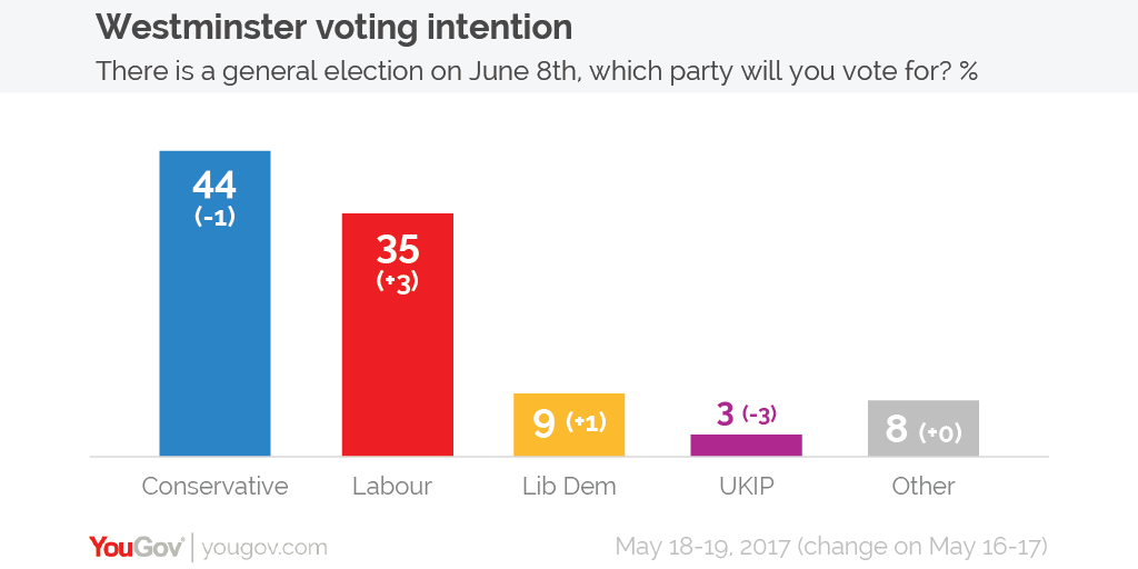 Secondo quanto affermato da una recente analisi di YouGov pubblicata sul Sunday Times, il 44% delle preferenze sono andate a favore dei conservatori, il 35% a favore dell’opposizione laburista, il 9% a favore dei democratici e il 3% a favore dell’UKIP.
