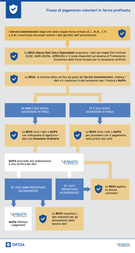 Con questa infografica NoiPA ha spiegato ai militari volontari come funziona il flusso dei pagamenti degli stipendi, confermando poi che gli arretrati non pagati ad ottobre verranno inseriti al più presto dai Servizi Amministrativi nella Banca Dati Unica Stipendiale per poi essere trasmessi a NoiPA.