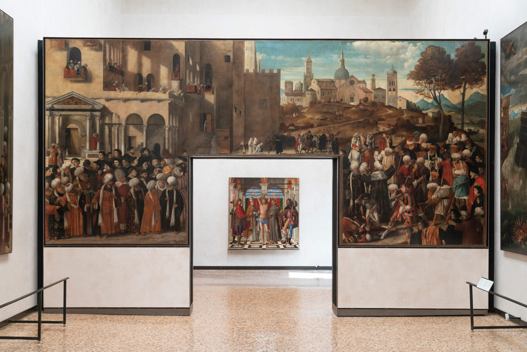 Tra questi, l’enigmatica Tempesta di Giorgione, il maestoso Miracolo dello schiavo di Tintoretto, la splendida e delicata Madonna dei Cherubini rossi di Giovanni Bellini, l’incantevole Madonna con bambino di Tiziano e l’intero Ciclo delle Storie di Sant’Orsola di Carpaccio.