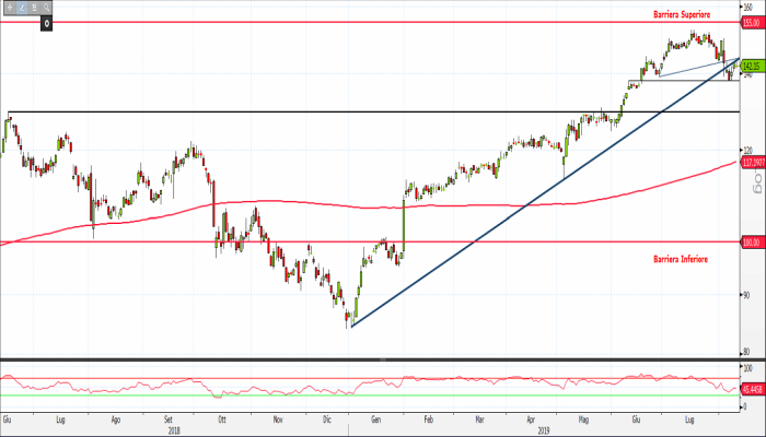 Dopo aver rimbalzato sull’area di concentrazione di domanda a 137,95 euro, lasciata in eredità dai top dell’11 giugno 2019, i corsi hanno effettuato il pullback della trendline menzionata prima e di quella ottenuta collegando i bottom del 27 giugno a quelli del 31 luglio 2019. Ad attrarre i venditori è stata anche la divergenza di inversione bearish sull’RSI settato a 14 periodi.