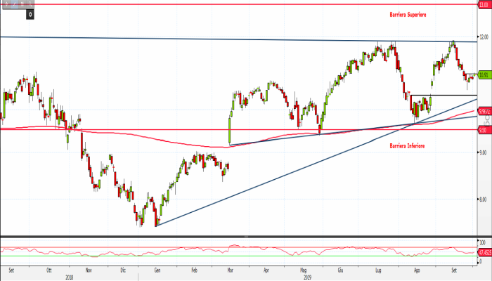 Visto quanto emerso dall’analisi tecnica, si potrebbero valutare strategie laterali con il Corridor Certificate di Société Générale di ISIN LU2000237656. Il prodotto presenta una Barriera Superiore a 13 euro, al di sopra del livello di concentrazione di offerta evidenziato prima. La Barriera Inferiore è invece localizzata a 9,50 euro, sia al di sotto del supporto dinamico, sia alla media mobile semplice a 200 giorni.