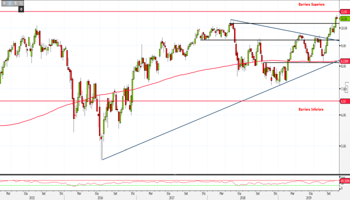 Il prodotto presenta una Barriera Superiore a 11 euro e Barriera Inferiore a 6,50 euro. Per tutelare parte del capitale investito si potrebbe inserire uno stop loss individuabile a 10,76 euro. L’obiettivo di prezzo è invece localizzabile a 10,24 euro.