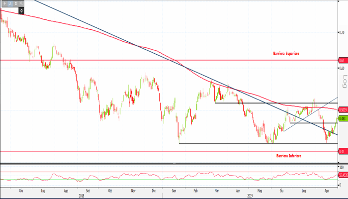 A sorreggere i corsi è stata l’area supportiva compresa tra 0,4575 e 0,433 euro. In questa zona transitano infatti la linea di tendenza di lungo periodo che collega i top del 7 maggio 2018 a quelli del 7 marzo 2019, e il livello statico lasciato in eredità dai minimi del 23 gennaio scorso.