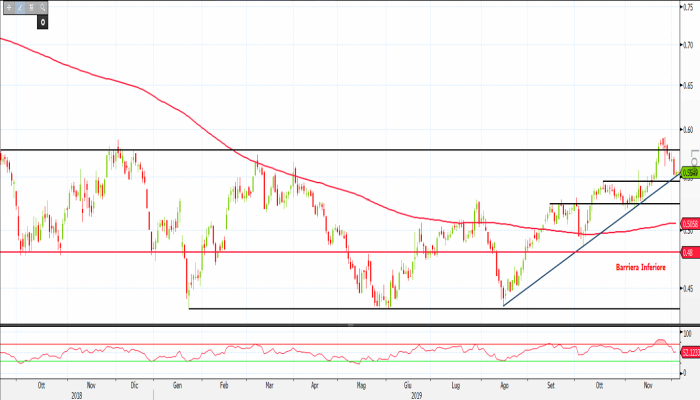 La discesa degli scorsi giorni ha portato però le quotazioni verso due supporti importanti: il primo di natura dinamica, ottenuto collegando i minimi del 14 agosto a quelli del 4 ottobre 2019, il secondo è statico e deriva dai top del 17 ottobre scorso.