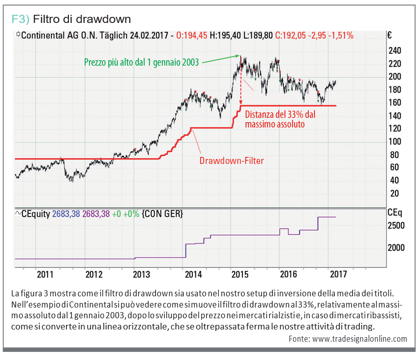 La figura 3 mostra il corso del filtro di drawdown nell’esempio di Continental. A questo punto potremmo stringere ancora di più la presa e impostare il filtro di drawdown, per esempio, al 20%. In questo modo, sarebbe possibile influenzare direttamente il numero di trade proposti da questa strategia. Un altro requisito è che questo setup non venga utilizzato nel mese di agosto. Ciò è dovuto allo scarso giro di affari di quel periodo.