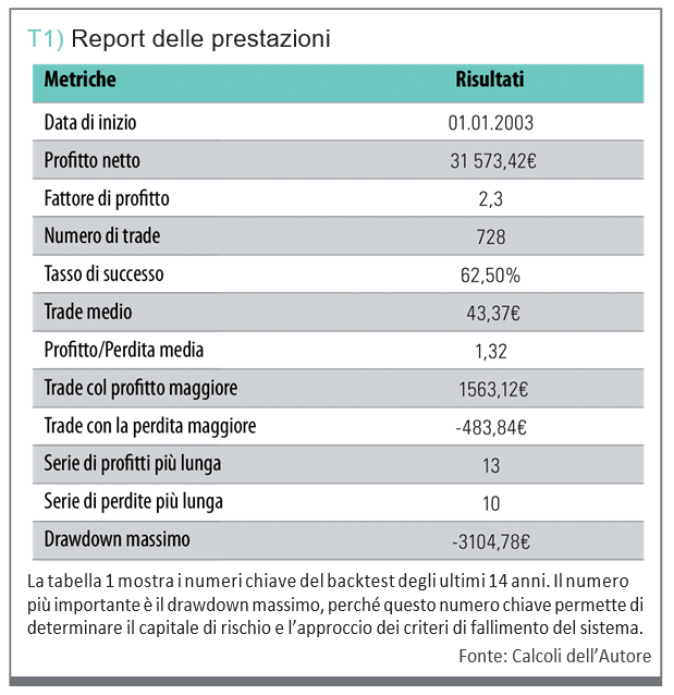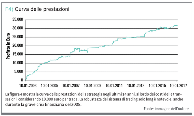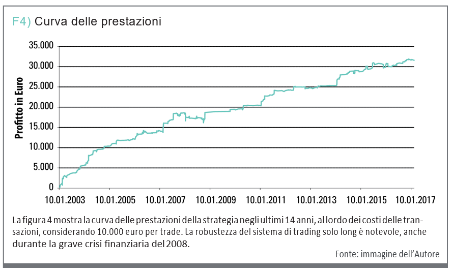La figura 4 mostra la curva di prestazione dal 1 gennaio 2003 al 24 febbraio 2017. È il risultato di un totale di 728 trade, e mostra un profitto di 31.573 euro al lordo dei costi di transazione. La robustezza di questa curva di prestazione, ma anche gli altri importanti numeri chiave del report di prestazione dalla tabella 1, rendono l’approccio dell’inversione della media dei titoli un buon candidato per il nostro portafoglio diversificato di sistemi.