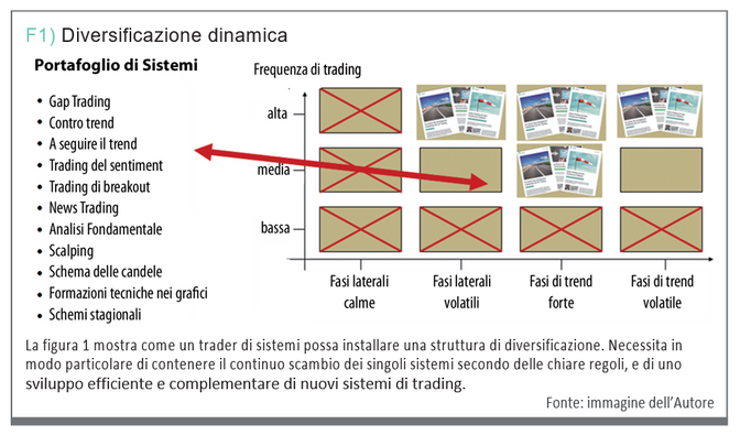 La figura 1 mostra come può apparire una struttura superiore di diversificazione. L’autore classifica il sistema di inversione della media dei titoli nelle categorie “fasi laterali volatili” e “fasi di trend volatili”. Descriverebbe la frequenza di trading come “bassa frequenza”. Seguendo la logica del grafico, l’obiettivo diventa quello di riempire ogni fase del mercato e ogni frequenza con una o due strategie robuste e redditizie.