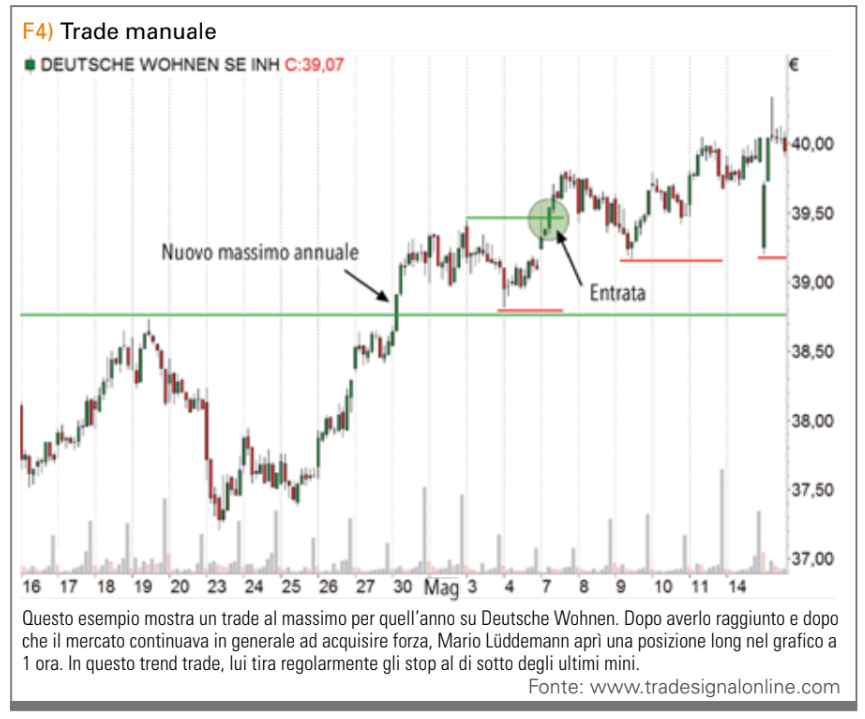 Due esempi sono il trading del trend subordinato emergente dalla correzione così come il trading sui massimi annuali. Un buon esempio di un trader sui massimi annuali si può vedere sulle azioni Deutsche Wohnen. Dopo che lo stock riuscì a segnare un nuovo massimo per quell’anno e il mercato in generale continuò ad acquisire potenza, decisi per la base oraria per questo trade.