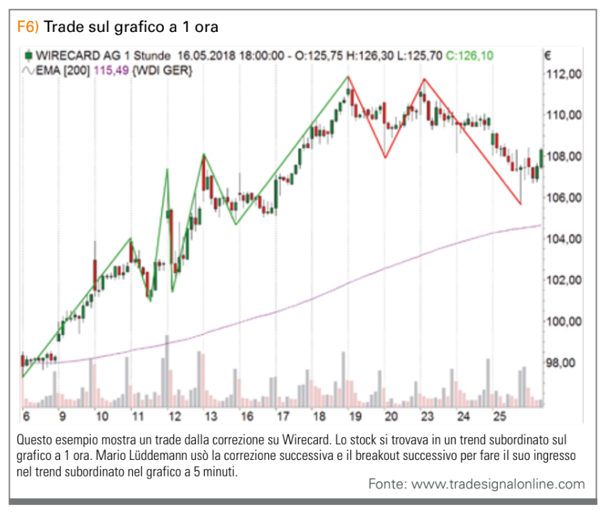 Il grafico mostra sia il nuovo massimo per l’anno che l’entrata conseguente. È un trend trade. Di solito metto gli stop al di sotto degli ultimi minimi. Qui vediamo un trade tipico dalla correzione su Wirecard. Lo stock si trovava in un trend positivo di un’ora sul grafico a 1 ora. Ho usato la correzione successiva per entrare nel trend subordinato nel grafico a 5 minuti. Questo tipo di trading inoltre mi consente di trovare un ingresso a basso rischio e alto guadagno.