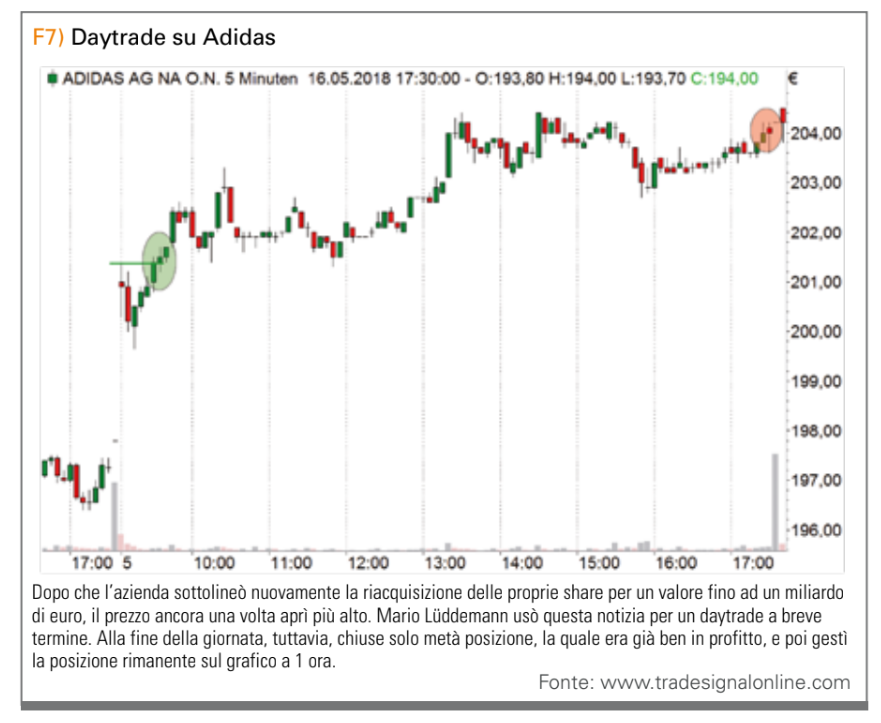 Qui, guardo, dopo l’annuncio di notizie rilevanti, come si comporterà il mercato nei primi minuti, e poi entro seguendo il trend di mercato a livello tecnico del grafico a 1 minuto. Di solito aspetto fino all’apertura di Xetra e non entro prima. Un’eccezione sono notizie alle quali so per certo come reagirà il mercato - come aumenti di capitale (reazione negativa) o speculazione su acquisizioni (reazione positiva). Qui inoltre faccio un trade prima degli orari ufficiali.