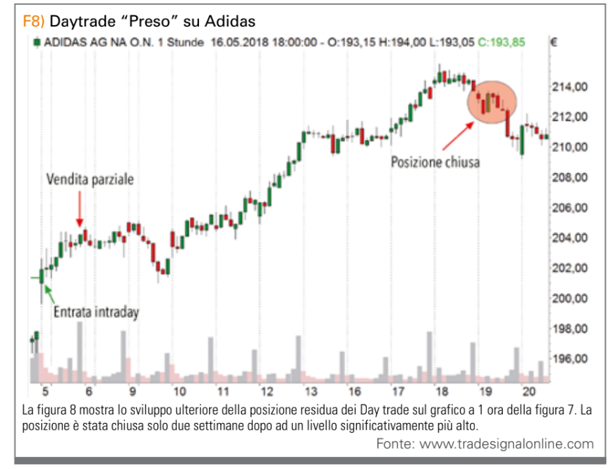 Tuttavia, a volte uso un’altra tecnica, in realtà redditizia: su alcuni trade giornalieri particolarmente dinamici, vendo solo la metà e porto a casa il resto per uno swing trade. Poi gestisco quest’ultimo tramite trailing stop nel grafico orario. Se le cose vanno bene, più tardi venderò un altra metà e la prenderò come trade posizionale sul grafico giornaliero.