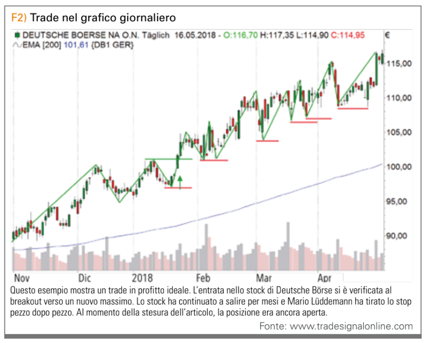 Il mio metodo si basa sui principi della tecnologia di mercato, che in principio si rifà alla Dow Theory. Le regole sono programmate nel mio software di trading, in modo che tutti i candidati long o short vengono visualizzati la mattina tramite screening automatico. Inoltre, considero anche fattori come il mood generale, le notizie e la stagionalità.