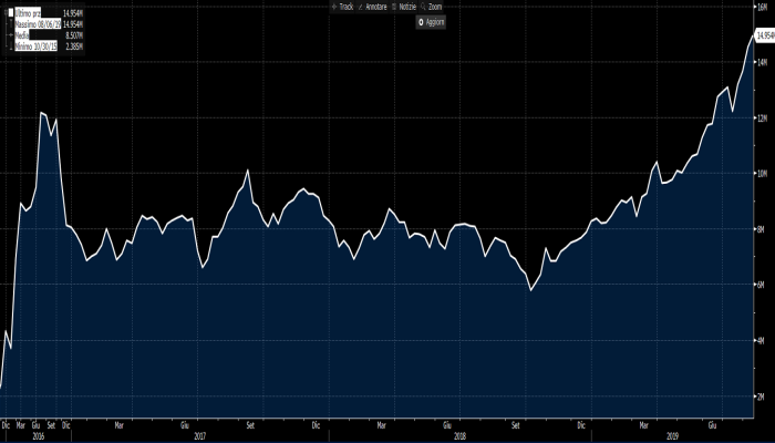 Il trend in corso ha iniziato a salire vistosamente alla fine del 2018, complici gli atteggiamenti ultra accomodanti delle banche centrali, in particolare BCE e Fed. Nel Vecchio Continente, il fenomeno della discesa degli yield dei bond governativi è particolarmente forte in Germania, con il rendimento del Bund a 10 anni che ha raggiunto un nuovo minimo storico: al momento della scrittura, lo yield del titolo di Stato decennale tedesco è del -0,599%. In questo quadro, il future sul Bund ha raggiunto un nuovo top assoluto, a 177,56 euro.