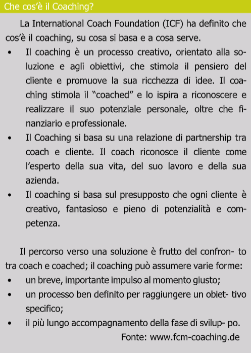 Fare self-coaching significa riconoscere i propri punti di forza e le proprie debolezze. Naturalmente, questa può essere un’esperienza dolorosa. Tuttavia, il coach non vi lascerà soli, ma sarà aperto alle vostre domande. Questo tipo di coaching è appropriato se il coach non vive vicino a voi. Passo dopo passo imparerete a conoscervi meglio e sarete in grado di reagire adeguatamente in situazioni importanti.