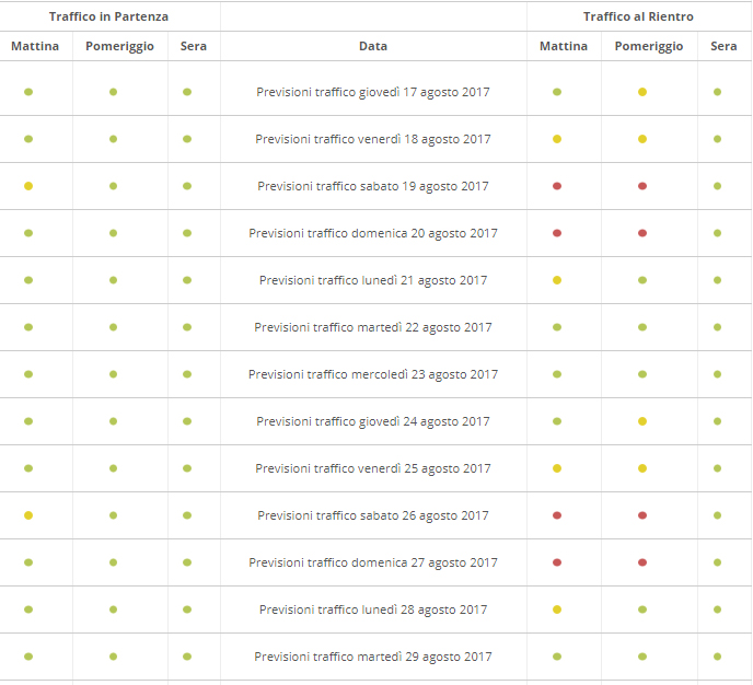 Il colore dei bollini indica il livello di traffico atteso in determinati giorni e orari. Nel dettaglio: