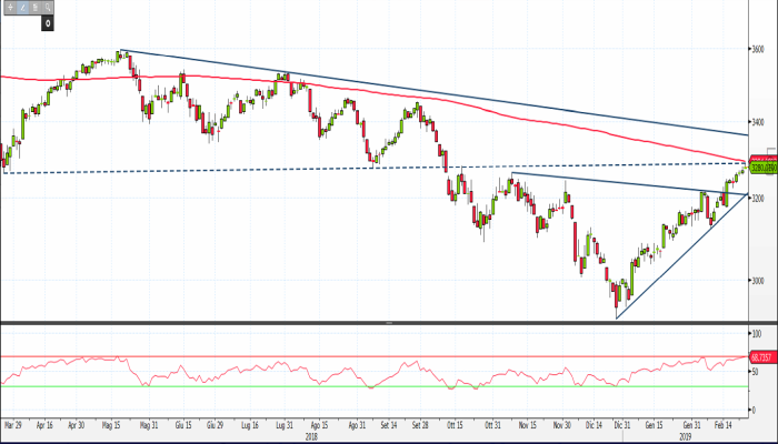 Per la tenuta dell’impulso bullish che prosegue da inizio anno è importante che le quotazioni restino al di sopra della linea di tendenza disegnata con i lows del 27 dicembre 2018 e quelli dell’8 febbraio scorso.
