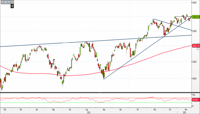 Un impulso discendente potrebbe spingersi verso l’area dei 23.000 punti, dove transita la linea di tendenza ottenuta collegando i top del 12 e 27 novembre 2019. A rafforzare la zona è anche il livello dinamico che collega i massimi del 21 settembre 2018 e dell’11 luglio 2019. In tal senso, a ridosso del supporto menzionato si potrebbe ricominciare la ricerca di occasioni d’acquisto.