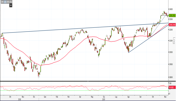 In questo senso, un possibile obiettivo dei venditori sarebbe individuabile tra i 22.457 punti e i 22.624 punti. In tale zona transitano infatti due importanti trendline: la prima ottenuta collegando i lows del 14 agosto a quelli del 3 ottobre 2019, la seconda invece con i massimi del 25 settembre 2018 e del 15 luglio 2019.