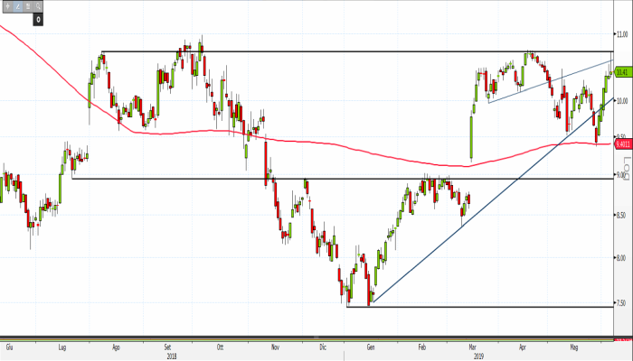 L’area che ha respinto le quotazioni non è casuale: tra 10,59 e 10,71 euro transitavano due resistenze: la prima dinamica ottenuta collegando i minimi del 25 marzo a quelli del 12 aprile 2019, la seconda statica e lasciata in eredità dai top del 7 agosto 2018.