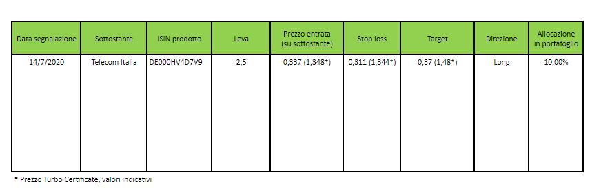 Nel nostro portafoglio, tramite il quale investiamo utilizzando Turbo Certificates, questa settimana entra una posizione rialzista su Telecom Italia.