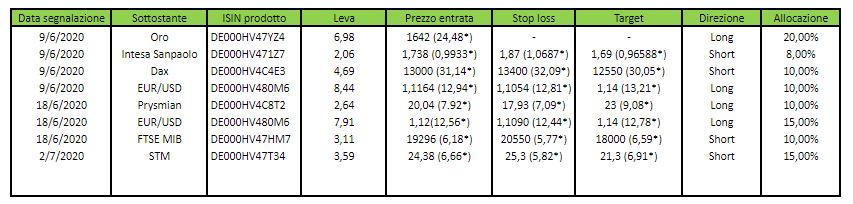 I prodotti e le rispettive leve sono stati selezionati alle 11:05 del 13 luglio 2020. Le strategie si considerano valide se i prezzi toccano il punto di entrata prima del take profit o dello stop loss.