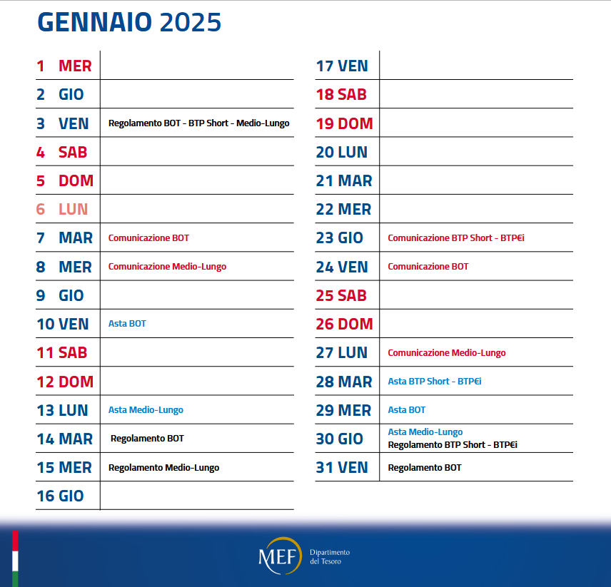Il calendario delle emissioni di BTP e BOT nel gennaio 2025