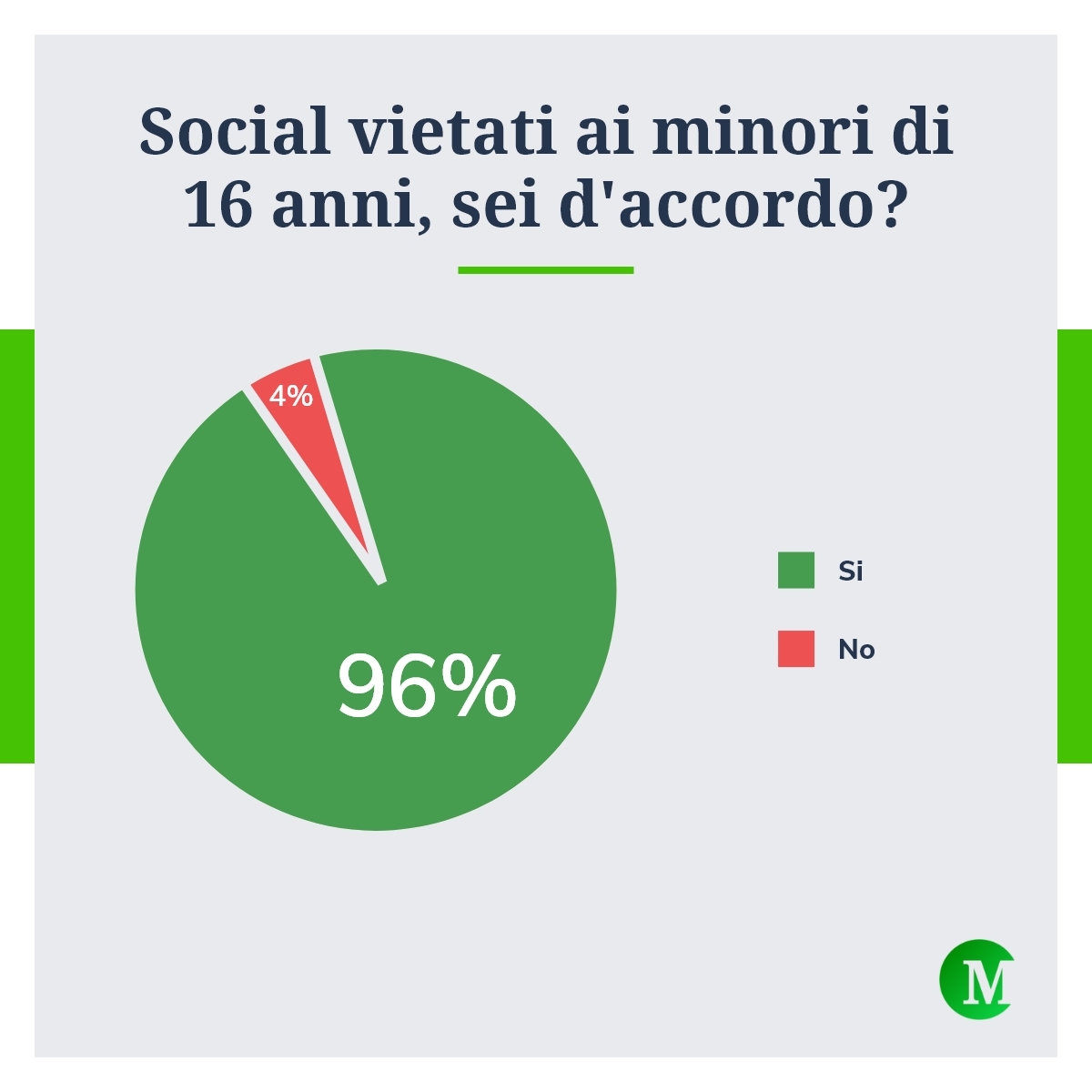 Come si può vedere dai risultati del sondaggio, che ricordiamo non ha un valore scientifico ma soltanto indicativo non essendo stato realizzato a campione, per il 96% dei rispondenti sarebbe giusto anche in Italia vietare i social ai minori di 16 anni.