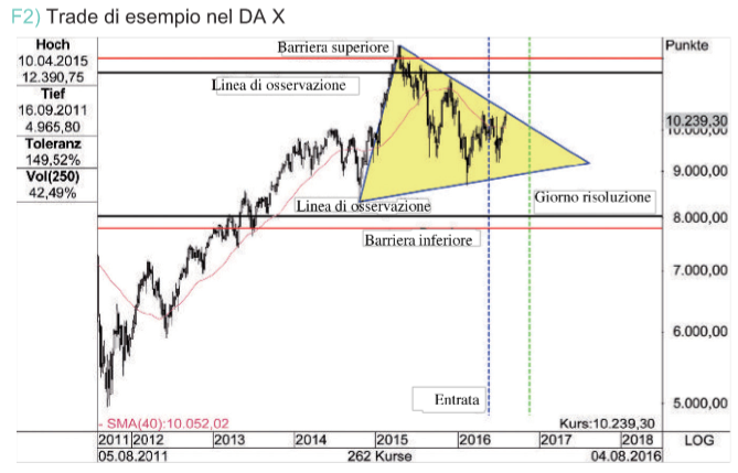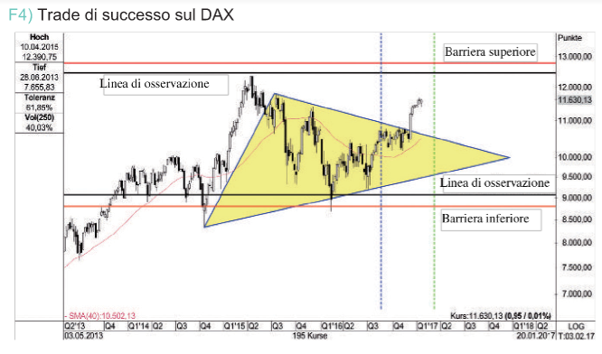 Se l’indice azionario tedesco fosse rimasto all’interno delle linee rosse, l’emittente avrebbe pagato 10 euro: un profitto appena inferiore al 30% e quindi anche leggermente superiore al profitto minimo del 25%. Una volta tracciate le barriere, è necessario trovare un triangolo informativo all’interno delle linee rosse nella sottostante (contrassegnato in giallo).