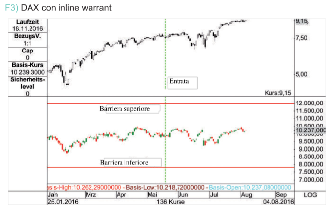 Come potete vedere, alla fine di luglio 2016, il DAX raggiungeva la linea blu superiore del triangolo per poi rimbalzarci sopra. Ora si potrebbe pensare che il certificato corrispondente avesse un prezzo più basso assegnato dall’emittente. In figura 3 tuttavia, si dimostra il contrario. Nella sezione superiore, viene mostrato il prezzo della Inline Warrant sul DAX, nella parte inferiore, il prezzo corrispondente dell’indice.