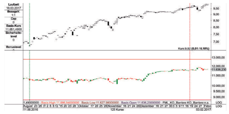 Queste cosiddette linee di osservazione rappresentano un contrassegno per voi su cui focalizzare l’attenzione. Le linee di osservazione sono situate ad una distanza di 300-400 punti all’interno delle barriere ed indicano che il sottostante corre sospettosamente vicina alle stesse. È tempo di chiudere la posizione prima di venire gettati fuori dal trade con una perdita totale. Il motivo: se il DAX aumenta o diminuisce in direzione delle linee nere in questo esempio, qualcosa è cambiato nel comportamento del mercato.