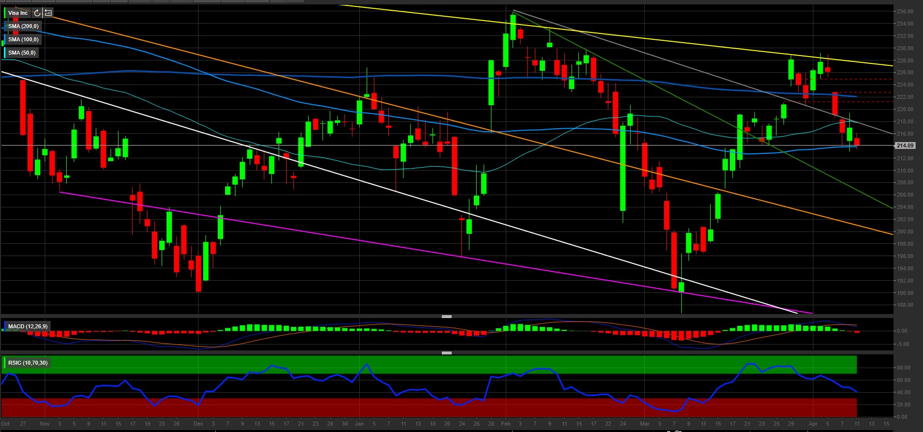 Con un indice di forza relativa di poco sopra i 40 punti, potremmo assistere a nuovi rialzi: da 216 dollari si potrebbe aprire una posizione “long” in direzione dei 222 e dei 225,5 dollari. Lo stop loss potrebbe essere fissato a 208 dollari.