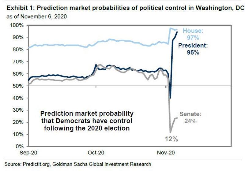 Se questo possibile epilogo ha visto le sue percentuali di realizzazione crollare dal 51% della fine della campagna elettorale al 9% dell’Election day, già oggi il mercato ri-prezza quell’outcome in risalita al 23%. Attenzione quindi al possibile cambio di strategia nei trades, alla luce di un dualismo che Goldman Sachs sintetizza con la formula Blue wave/Divided government.