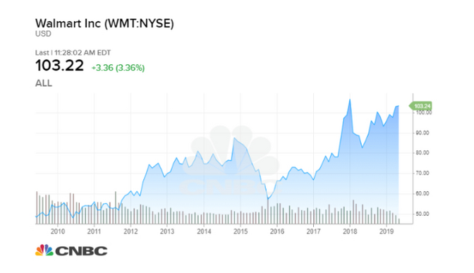 L’andamento delle azioni Walmart negli ultimi 10 anni secondo il grafico targato CNBC dello scorso 16 maggio, quando il titolo ha toccato quota 103 dollari subito dopo i conti trimestrali.